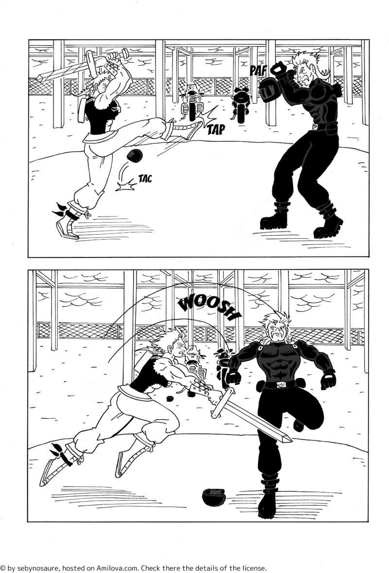 j'ai mis un peu de temps avant de comprendre pourquoi je n'aimais pas cette page. La longueur de l'épée case 1 ne colle pas avec celle de la case 2 qui elle équivaut à celle de la case 3 page 10, soit deux pages avant. Bref cette épée n'a pas toujours la même longueur et ça se voit.