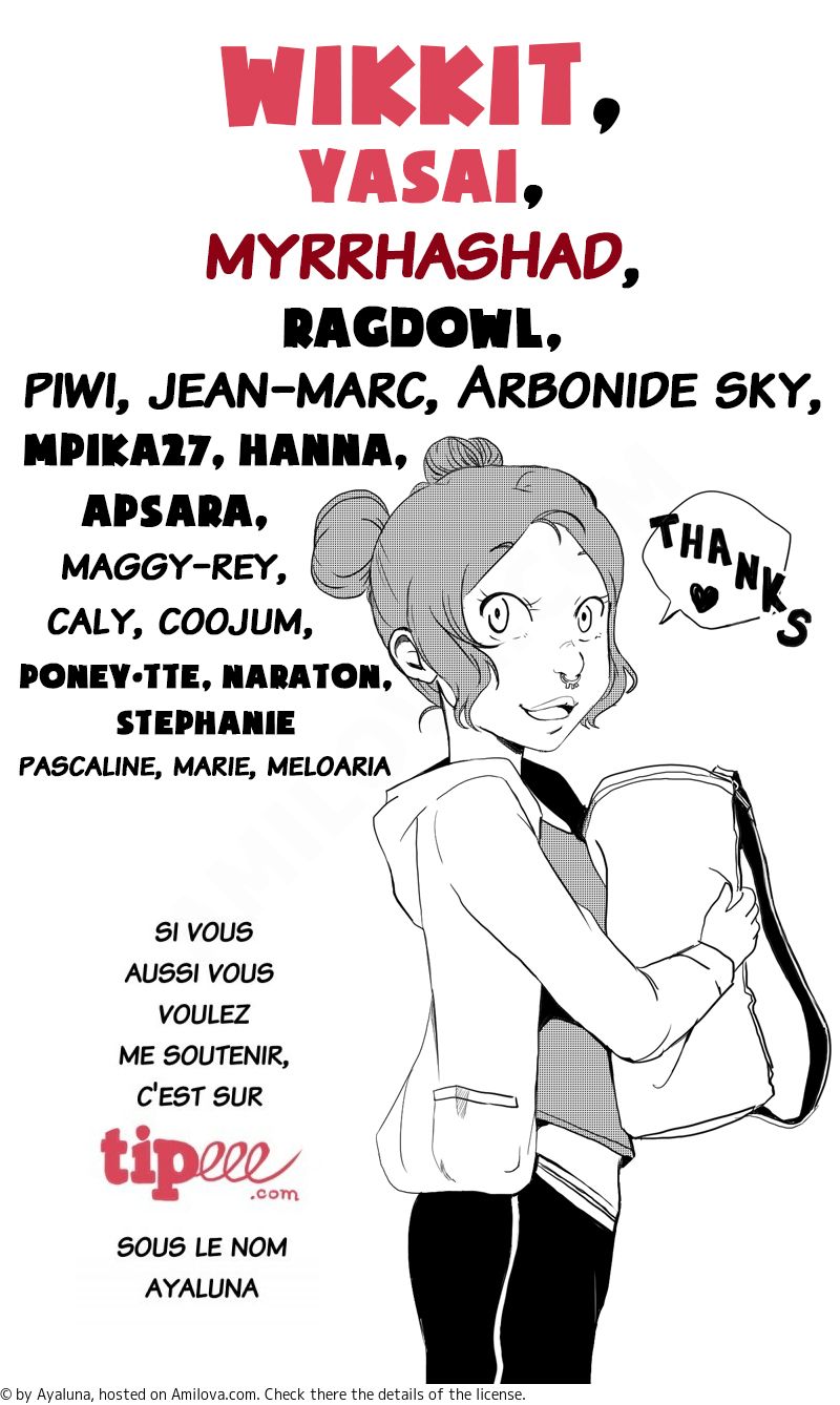 Ayaluna 11/07/2019 19:09:49Bah c'est aussi un peu grâce à eux que je peux lire cette histoire. Donc c'est normal de les remercier aussi.