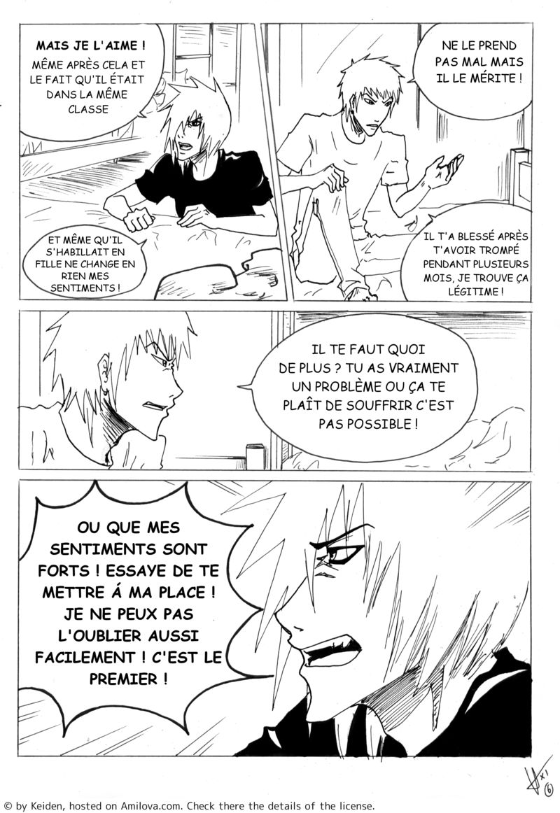 Keiden 12/03/2011 10:39:12La deuxième bulle dans la case 2 est...bizarre, ça fait drôle quand tu lis tout haut pour moi. Qu'en pense-tu ? Ce ne serait pas mieux:"Et même si il s'habillait en fille, ça ne change en rien mes sentiments !" ? C'est à toi de voir.