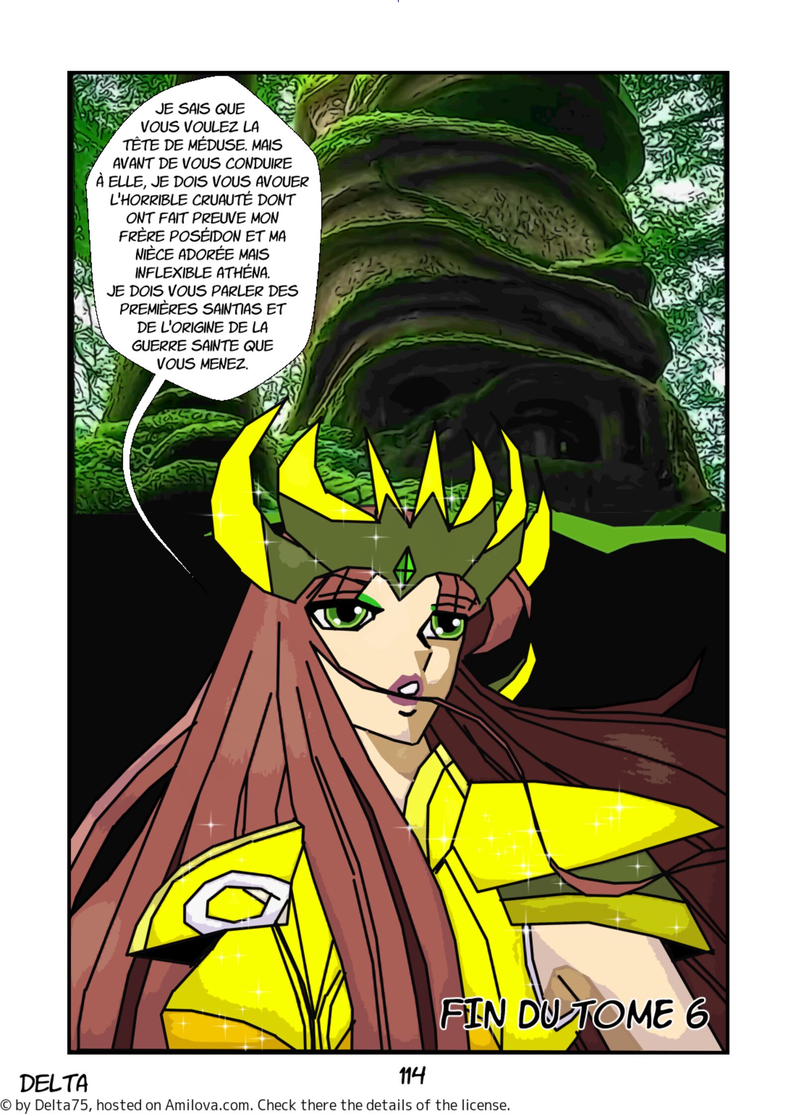 Je sais que vous voulez la tête de Méduse. Mais avant de vous conduire à elle. Je dois vous avouer l'horrible cruauté dont ont fait preuve mon frère Poséidon et ma nièce adorée mais inflexible, Athéna. Je dois vous parler des premières saintias et de l'origine de la guerre sainte que vous menez.